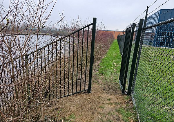 In Hoofddorp hebben wij een looppoort met aansluitend hekwerk geplaatst op een talud met een slootwaaier. Een slootwaaier is een waaiervormig hekwerk dat bij een sloot wordt geplaatst.