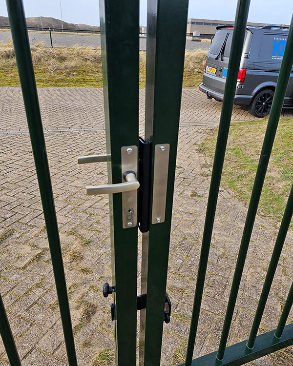 Door de zware omstandigheden in de duinen en de zeelucht was de bestaande dubbele draaipoort volledig doorgeroest. We hebben een nieuwe dubbele draaipoort geplaatst met duplex bescherming (thermisch verzinkt + en dubbele poedercoating) voor maximale corrosiebestendigheid en een langere levensduur. De poort is uitgevoerd met RVS-scharnieren en sluitwerk, passend afgesteld op windbelasting, en netjes opgebouwd met nieuwe aanslagen en fundaties. Hierdoor is de toegang weer duurzaam, veilig en representatief.